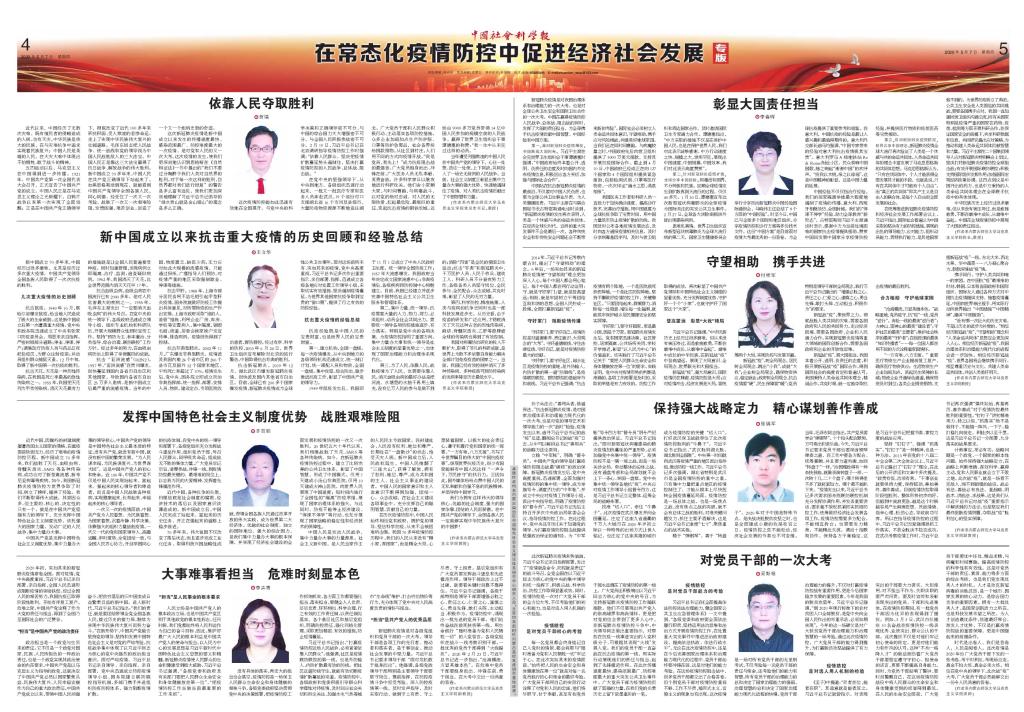 5月7日,中国社会科学院主管主办的《中国社会科学报》以“在常态化疫情防控中促进经济社会发展”为主题,专版刊发我校yl6809永利集团八位教师的“疫情防控专题研究”理论文章,分别是:贺瑞教授撰写的《依靠人民夺取胜利》、李春晖教授撰写的《彰显大国责任担当》、王立华教授撰写的《新中国成立以来抗击重大疫情的历史回顾和经验总结》、付桂军教授撰写的《守望相助,携手共进》、齐百顺教授撰写的《发挥中国特色社会主义制度优势,战胜艰难险阻》、李卉青副教授撰写的《大事难事看担当,危难时刻显本色》、张瑞军副教授撰写的《保持强大战略定力,精心谋划善作善成》和妥斯根博士撰写的《对党员干部的一次大考》。