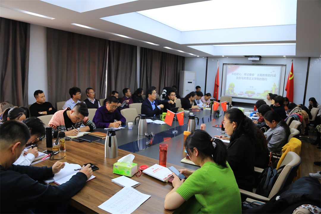 10月28日下午,在yl6809永利集团507会议室,党总支书记贺瑞以“不忘初心、牢记使命主题教育的内涵及在yl6809永利集团的践行”为题,为学院师生讲授“不忘初心、牢记使命”主题教育专题党课。校第五主题教育指导组周绍渊同志到会指导。