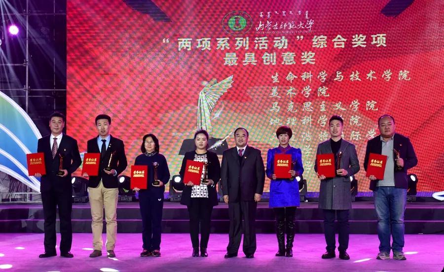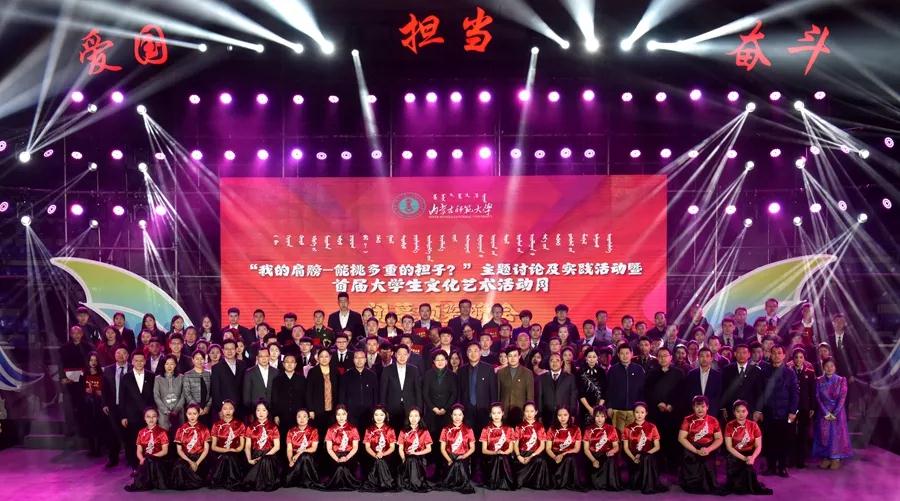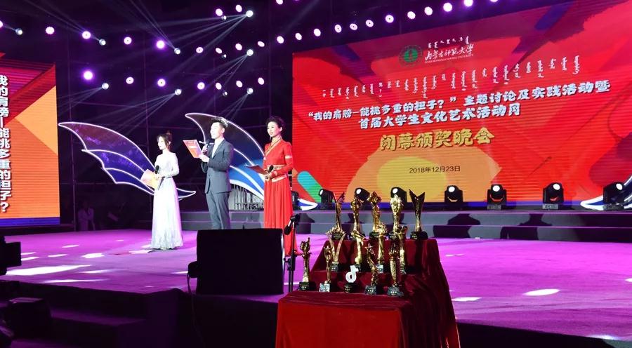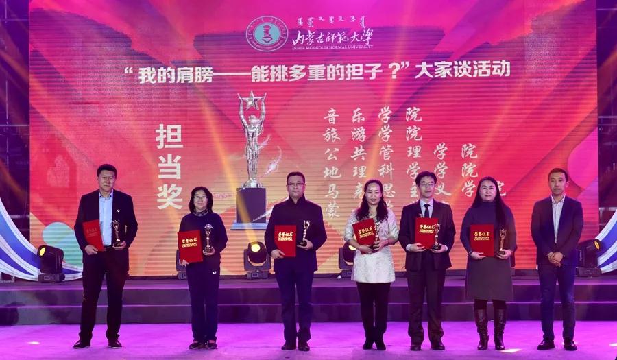 12月23日晚,yl6809永利官网集团“我的肩膀——能挑多重的担子?”主题讨论及实践活动暨首届大学生文化艺术活动月颁奖晚会在赛罕校区体育馆举行。校党委书记黄雅丽,党委副书记、纪委书记高云峰,副校长刘九万,党委委员、党委宣传部部长张宝成及相关部门负责同志出席活动并为获奖师生颁奖。我院党总支书记贺瑞,副书记、副院长阿荣,团总支书记范晓刚以及付桂军教授参加了本次活动。