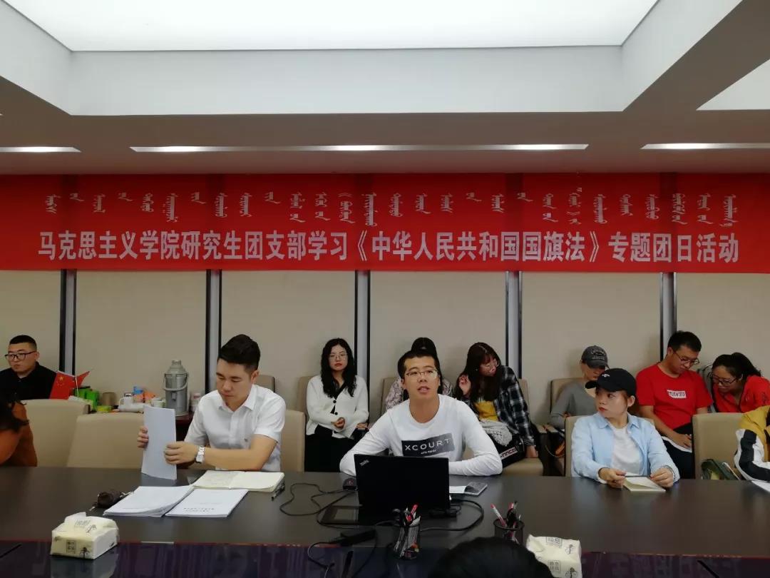 为迎接新中国成立70周年,按照学校党委的安排和校团委的统一部署,我院于9月19日下午在赛罕区行政楼507会议室开展了学习《中华人民共和国国旗法》专题团日活动。团总支书记范晓刚老师及全体研究生参加了本次活动。