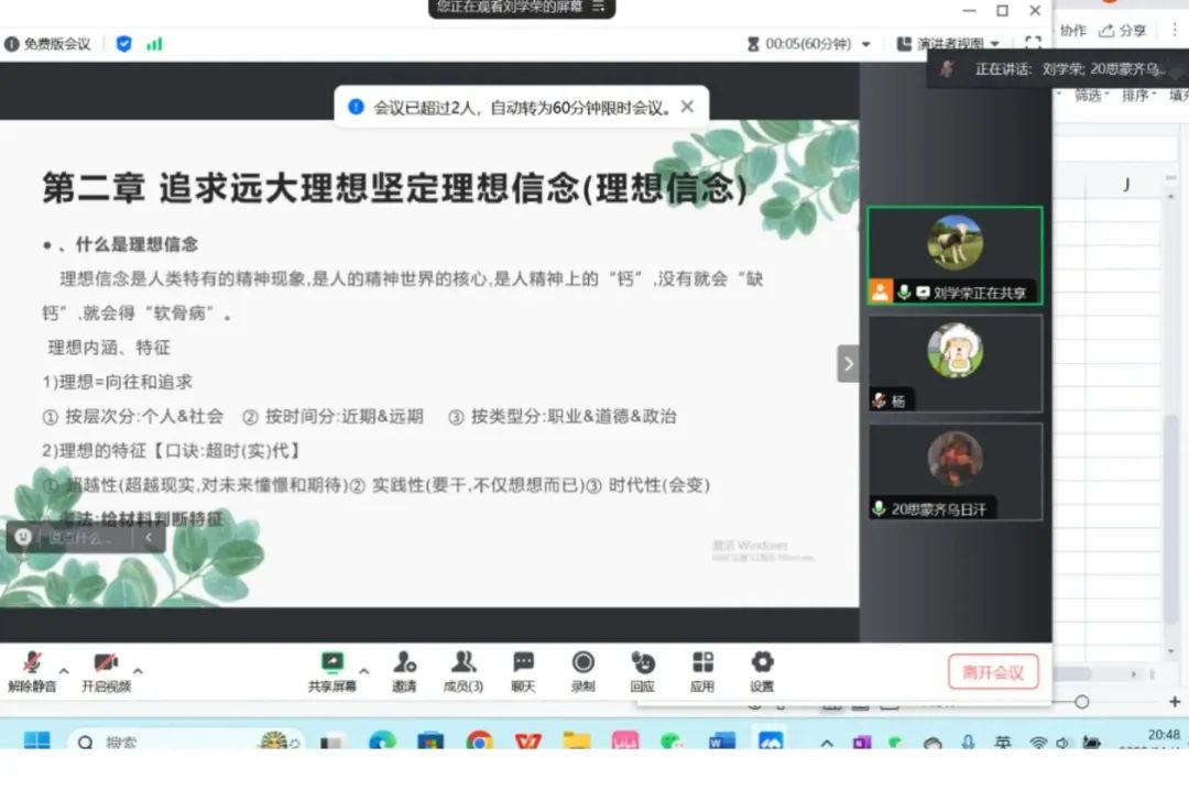 2023年10月28日至11月19日,参与活动的研究生志愿者为本科生进行教学辅导。图为2023级马克思主义理论专业研究生刘学荣正在为小组成员进行线上辅导。