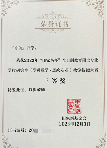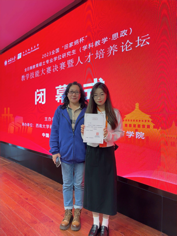 本次比赛共有来自华中师范大学、山东师范大学、上海师范大学等全国75所院校的188名选手入围决赛。决赛赛程分为:现场抽题、限时备课、授课答辩三个环节。经过激烈角逐,在刘爱华副院长和乌晓晔副教授的精心指导下,我院2022级学科教学(思政)专业硕士研究生何沅获得三等奖。