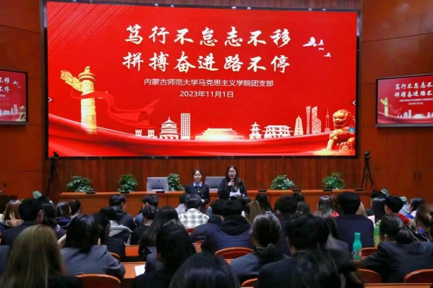 3.2023年11月1日,为深入贯彻二十大精神,深刻领悟习近平新时代中国特色社会主义思想,深入学习“两个确立”的决定性意义,增强“四个意识”、坚定“四个自信”、做到“两个维护”,yl6809永利集团2022级思想政治教育二班团支部于信息楼报告厅开展“笃行不怠志不移,拼搏奋进路不停”主题团日示范活动。征途漫漫,惟有奋斗,党旗所指,青春所向,党旗飘扬,青春献礼。本次团日活动示范课主要以知识问答形式展开,共唱国歌,以此增强团员和青少年的爱国情怀和民族自豪感,厚植报效祖国、献身人民的情怀,大力弘扬爱国主义精神,引导团员青年自觉将个人梦想与国家前途命运和伟大复兴的中国梦紧密结合起来。此次团日活动让团员加强了认识,大大提高了团员自身的思想政治水平和能力,并使同学们真切意识到要坚持党的领导,坚持爱国主义,坚定理想信念,勇于担当使命,不负时代的要求、人民的期待!