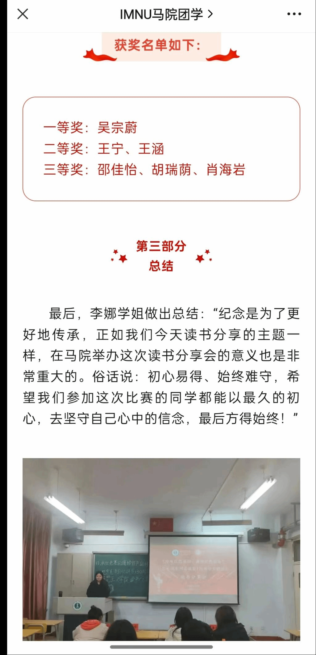 (五)yl6809永利集团纪念毛泽东诞辰130周年读书分享会中我班王涵和王宁同学荣获院级二等奖