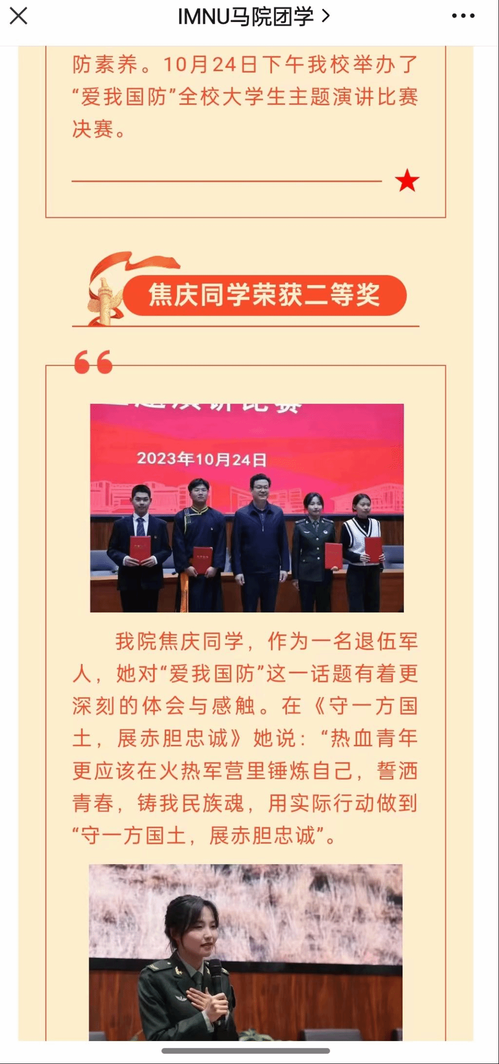 (三)yl6809永利官网集团“爱我国防”全校大学生主题演讲决赛中我班焦庆同学荣获校级二等奖,